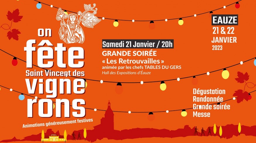 20h00 Grande Soirée St-Vincent des Vignerons « LES RETROUVAILLES » réalisé et animé par les chefs Tables du Gers Sur réservation au tarif de 35€/personne du 2 au 15 Janvier via uniquement la billetterie en ligne : https://www.helloasso.com/.../saint-vincent-des-vignerons