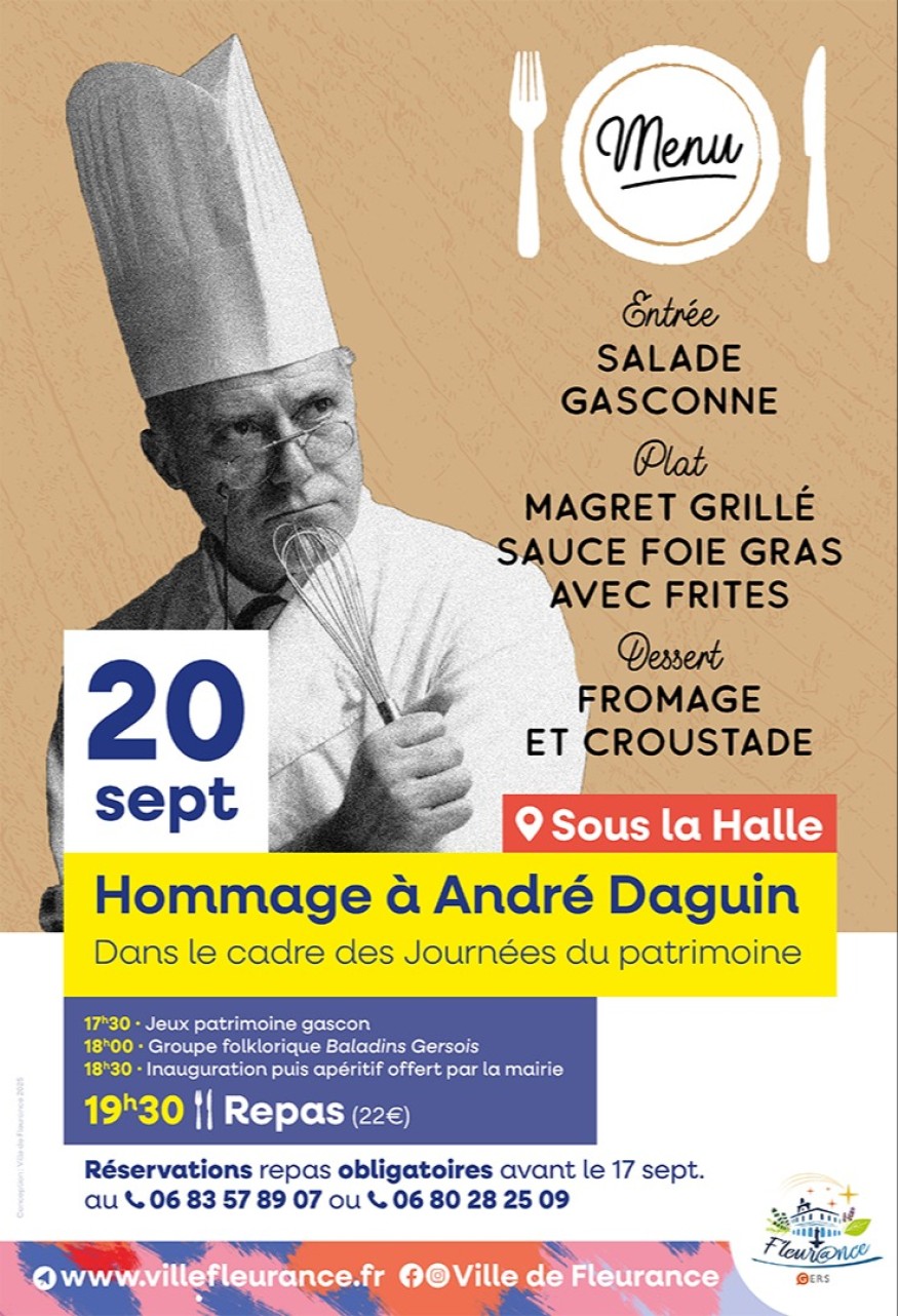 Samedi 20 septembre 2025, à l’occasion des Journées européennes du patrimoine, la Ville de Fleurance rendra hommage au regretté chef cuisinier André DAGUIN, qui a tant oeuvré de son vivant à mettre en avant la gastronomie gersoise.