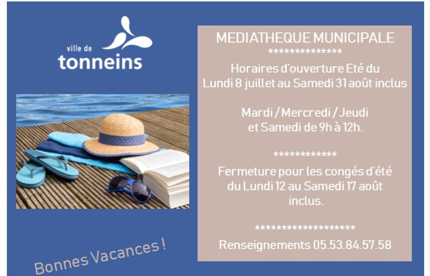 la Médiathèque de la ville de Tonneins passe en Horaires d’été à compter du 8 Juillet 2019.