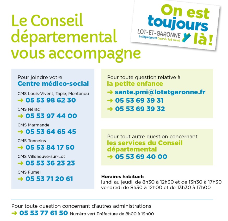 Depuis le début du confinement, le Conseil départemental assure la continuité de ses actions de solidarité, notamment en redirigeant ses interventions sur 3 Centres Médico-Sociaux (CMS de Villeneuve, Tonneins, Agen-Tapie), avec la mobilisation d’équipes composées d’assistantes sociales, de médecins, de puéricultrices et de sages-femmes. Cette organisation, tenant compte de l’impossibilité d’ouvrir au public, a permis jusqu’à présent de poursuivre malgré tout ses missions essentielles telles que la réponse aux situations d’urgence, l’accès aux droits, la protection maternelle et infantile, la vaccination habituelle des jeunes enfants…