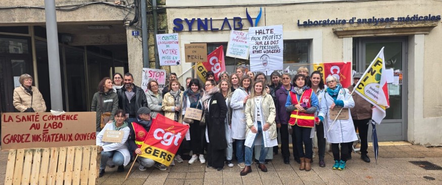 La mobilisation s’est renforcée ce jeudi 06 novembre devant le laboratoire d’analyses médicales Synlab d’Auch, où les salariés étaient en grève pour protester contre la fermeture annoncée du plateau technique départemental. Cette décision, prise par la direction du groupe Synlab Sud-Ouest, entraînerait la suppression de huit emplois qualifiés dans le Gers et le transfert des analyses vers d’autres sites, notamment à Aire-sur-l’Adour ou plus loin encore.