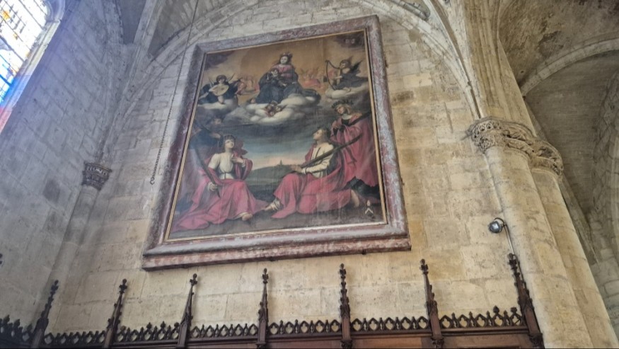 C’est une oeuvre monumentale de 3m30 par 2m90, intitulée « Apothéose de Gervais et Protais ». Elle est conservée dans la cathédrale et les armoiries de l’évêque, dans le coin en bas à droite, précise le commanditaire donc la date de l’oeuvre. Au premier plan les 2 saints martyrs du 1er siècle sont agenouillés, vêtus de de robes blanches symbole de pureté et de résurrection et sont drapés dans des manteaux rouges signe de la passion. Ils tiennent la palme du martyre attestant de leur fidélité jusqu’à la mort à la vraie foi chrétienne. Derrière eux leurs parents Saint Vital et Sainte Valérie, également martyrs. Au-dessus, la Vierge à l’Enfant, assise sur un nuage est entourée d’anges musiciens jouant du luth et de la harpe signifiant l’harmonie céleste. A l’arrière–plan, une ville sur une colline, identifiable à Lectoure par la silhouette de son clocher avec sa célèbre flèche qui surgit des ruines de la cathédrale. Cette oeuvre nécessite d’urgence une restauration: la toile est légèrement déformée, la peinture craquelée, encrassée, tachée par endroit d’humidité et de souillures de chauves-souris; on remarque un trou dans l’angle droit en bas, enfin le vernis ancien, jauni et irrégulier, modifie les couleurs.