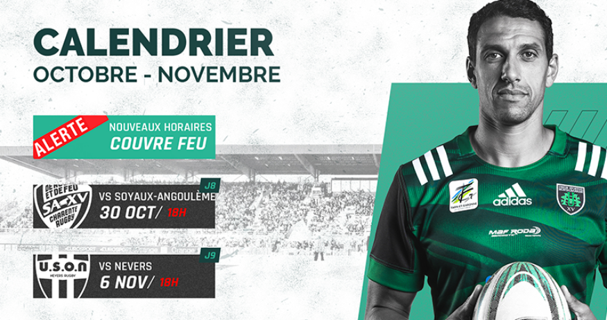 Suite aux annonces gouvernementales imposant un couvre-feu à partir de 21h sur un grand nombre de départements, dont le Tarn et Garonne, la LNR a décidé de modifier les horaires de matchs de Pro D2 afin que les supporters puissent venir au stade tout en étant dans la légalité en cas de circulation après-match. De ce fait, les matchs contre Soyaux-Angoulème (30 Octobre) et contre Nevers (6 Novembre) voient leur coup d’envoi avancé à 18h, soit 1h plus tôt que l’horaire annoncé. Nous prenons donc acte de cette contrainte supplémentaire, en plus de ne pouvoir accueillir l’ensemble de nos supporters, Montauban et le Stade de Sapiac étant soumis à une jauge de 1000 spectateurs maximum.