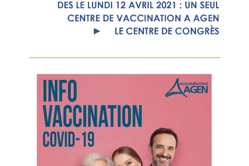 DES LE LUNDI 12 AVRIL 2021 : UN SEUL CENTRE DE VACCINATION A AGEN ► LE CENTRE DE CONGRÈS