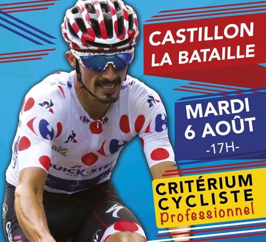 Chaque année 20 000 spectateurs viennent assister au dernier bastion du critérium français. Un événement organisé 10 jours après l'arrivée du Tour de France par un ancien cycliste Georges Barrière. 45ième Édition cette année. Le Criterium de Castillon la Bataille est sur circuit de côte de 3kms100 parcouru 30 fois, il réunit des champions du Tour de France. Venez nombreux les féliciter et les encourager! Ce critérium est une occasion unique de pouvoir côtoyer des champions internationaux dans une ambiance décontractée et conviviale, au milieu des vignobles et de la nature ! les têtes d'affiche qui seront présentes constituent l'un des plus beaux plateaux des critériums existant encore en France. Romain Bardet, meilleur grimpeur du Tour de France ; Warren Barguil, champion de France ; Alexis Wuillermoz, ALM ; Benoît Cosnefroy, ALM ; Kévin Ledanois, ARK ; Elie Gesbert, ARK ; Stéphane Rossetto, COF ; Julien Bernard, TRE ; Rudy Molard, FDJ ; William Bonnet, FDJ ; Yoann Offredo, WGG ; Valentin Madouas ; Maxime Bouet, mais aussi une quinzaine d'amateurs.