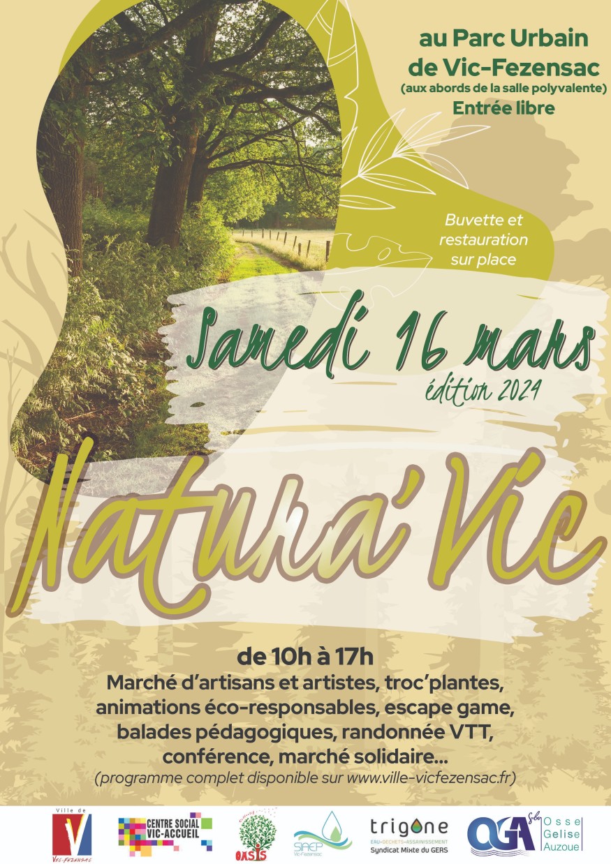 L’édition 2024 de NATURA’VIC se déroulera le samedi 16 mars 2024 au Parc Urbain (aux abords de la Salle Polyvalente) de Vic-Fezensac. Cette journée familiale de sensibilisation à l’écologie et l’environnement, est l’occasion pour les participants d’apprécier l’évolution de la nature.