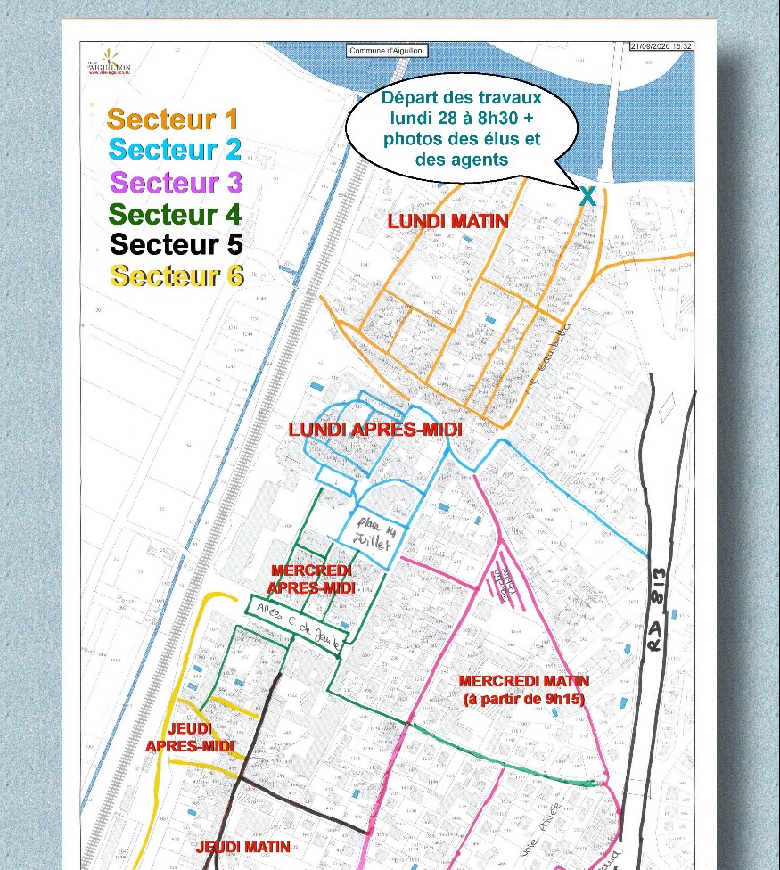 L’opération commence lundi 28 septembre et durera jusqu’au jeudi 1er octobre ; pour cela la ville a été divisées en 6 secteurs que vous pouvez retrouver sur le plan ci-joint.