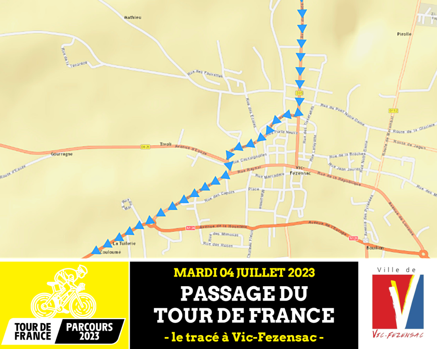 Arrivant de la D35, les coureurs passeront par la D626 jusqu’à la nationale 124. Autrement dit le Tour de France 2023 empruntera le tracé suivant dans les rues vicoises : route de Mouchan, Avenue du Stade, Chemin de Ronde, Rue des Femmes, Place Crespin, Avenue Edmond Bergès.