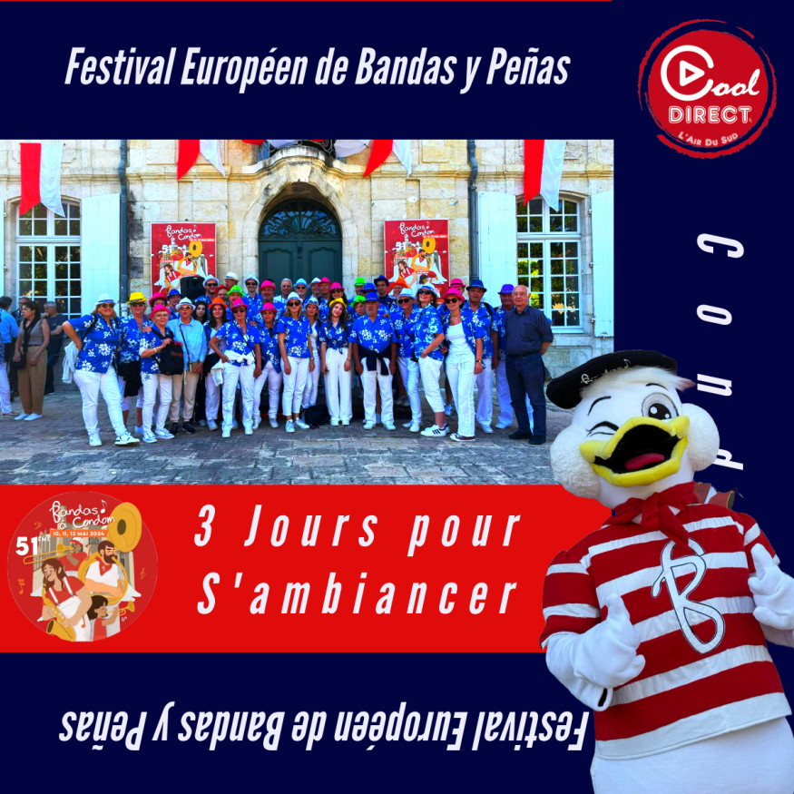 Le Festival de Bandas à Condom est un festival de musique de trois jours organisé chaque année à Condom, Gers, France. Il est connu comme le plus grand rassemblement de musiciens amateurs européens de cuivres et de percussions. Cette année, cela se passe aujourd'hui, du vendredi 10 mai au dimanche 12 mai 2024. https://www.festivaldebandas.fr/